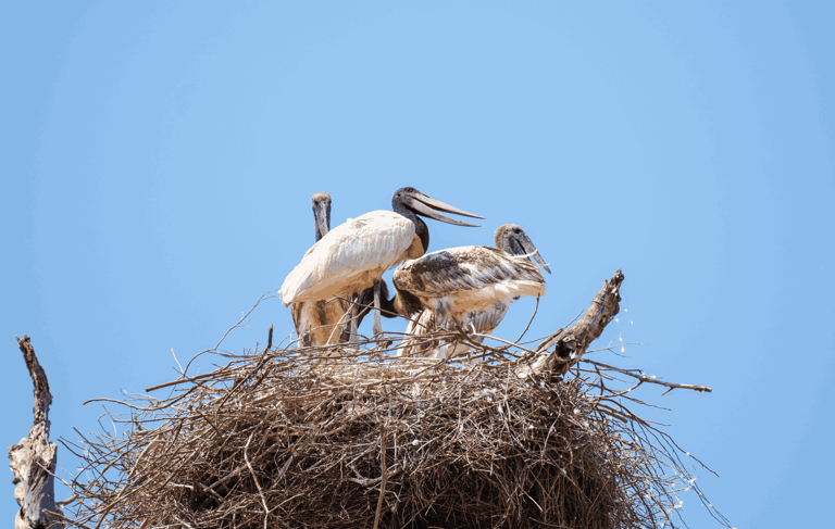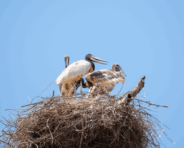 The jabiru stork, the symbol of the Pantanal wetlands, is easily recognized by its black neck and characteristic red stripe. Its giant nests, built high in the trees, can be seen from afar.